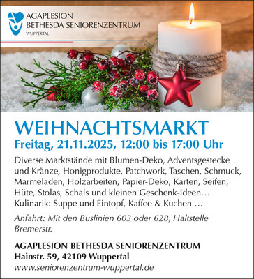 Am Freitag, den 21. November 2025, lädt das AGAPLESION Bethesda Seniorenzentrum herzlich zu einem stimmungsvollen Weihnachtsmarkt ein. Von 12:00 bis 17:00 Uhr erwartet Sie ein abwechslungsreiches Angebot an liebevoll gestalteten Marktständen.